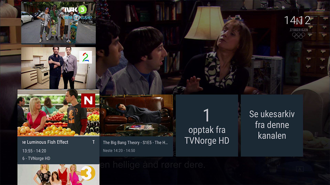 Kanallisten gir deg rask oversikt over kanalene. Kanalene som er inkludert i din kanalpakke vises på toppen av kanallisten. Har du lagt til kanaler som favoritter, vises de først. Kanalene du ikke abonnerer på vises lenger ned, med lås. Til høyre for hver kanal i kanallisten vises neste program, så vises dine opptak på denne kanalen. Og helt til høyre vises snarvei til ukesarkivet for kanalen.